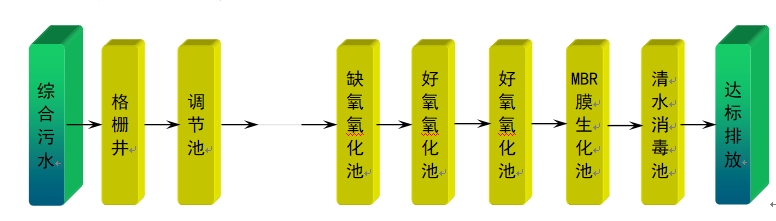 根據(jù)污水水質(zhì)及有關(guān)實踐經(jīng)驗,本著投資省、運(yùn)行費(fèi)用低、操作管理方便的原則,向建設(shè)一個高效、緊湊、省地、節(jié)能的污水處理廠靠攏,優(yōu)先采用適合我國國情的最佳使用技術(shù)的原則,根據(jù)目前國內(nèi)此類污水處理技術(shù)的現(xiàn)狀,在綜合考察各種廢水治理技術(shù)的基礎(chǔ)上,結(jié)合本項目的實際,擬采用“調(diào)節(jié)池+缺氧生物接觸氧化池+好氧生物接觸氧化池+MBR膜池+接觸消毒池”工藝進(jìn)行污水處理。